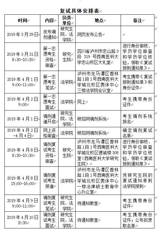 复试工作是研究生考试招生的重要组成部分,是保证选拔质量的重要环节。根据《西南医科大学2019年硕士研究生考试招生复试工作办法》文件精神,结合法学院实际,制定法律硕士研究生复试工作实施细则。