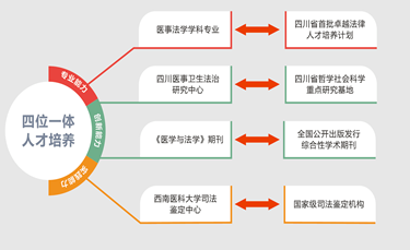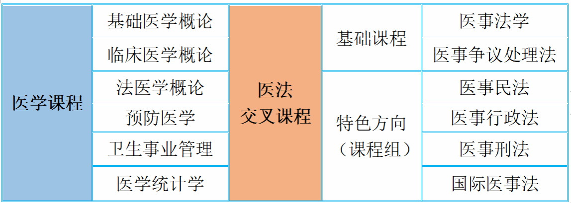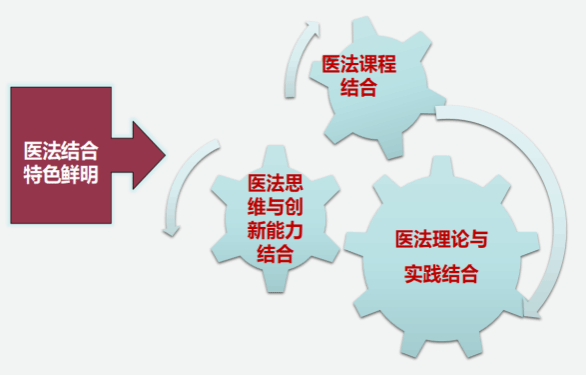 培养主要特色有三:一是精心打造法学、医学和医法桥梁课程体系,培养“医法结合”复合型人才;二是推行校内导师、校外医务实践导师和法律实践导师组成的“三导师”制,重视实践能力培养;三是依托“四位一体”平台育人,实现“产、学、研、用”的结合,促进卫生健康法学理论与实践的联系。