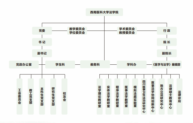 五个职能科室:党政办公室、教务科、学科办、学生科、《医学与法学》编辑部
