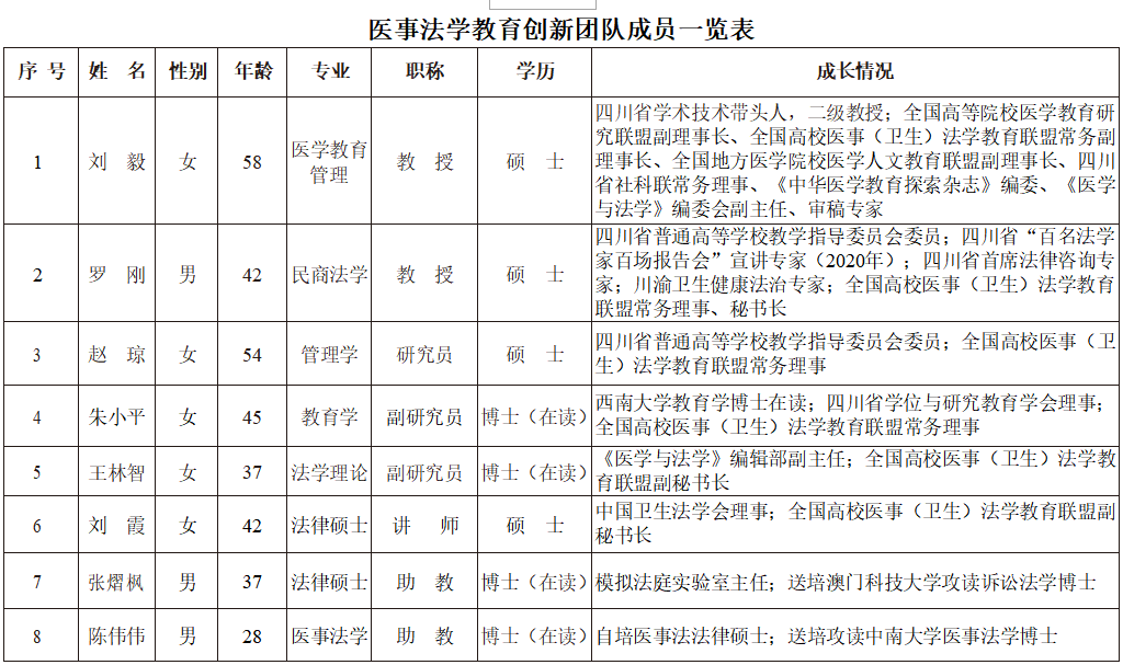 4.团队带头人刘毅等“基于应用创新特点的医事法学人才培养的研究与实践”“四川省卫生计生法治体系建设研究”,分获四川省第八届高等教育优秀教学成果三等奖和四川省第十八次社会科学优秀成果三等奖。