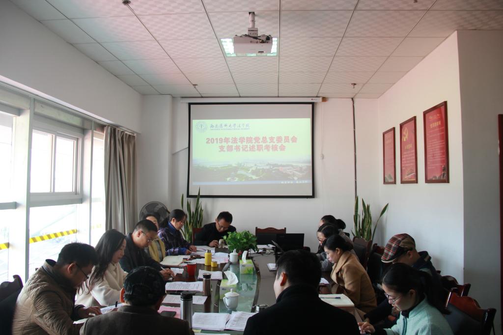 2019年12月6日上午,法学院召开教工支部“不忘初心、牢记使命”专题组织生活暨民主评议党员会议,同时进行了党支部书记述职考核。党总支委员、教工党支部全体党员参加了本次会议,会议由党支部书记王贵勤主持。