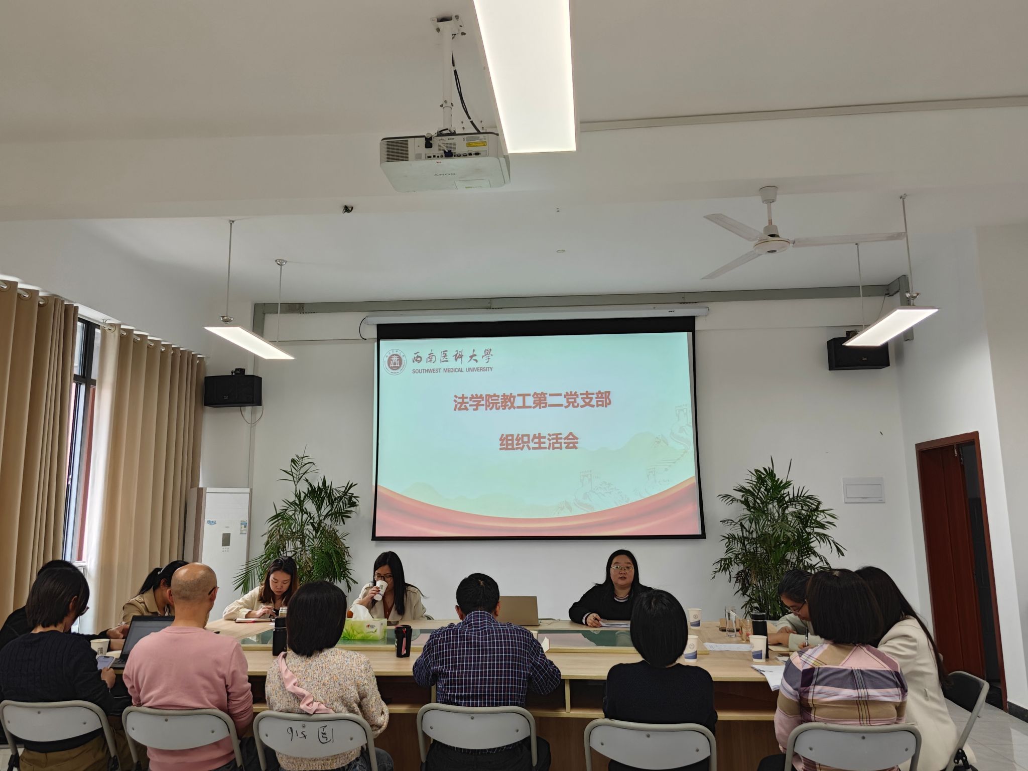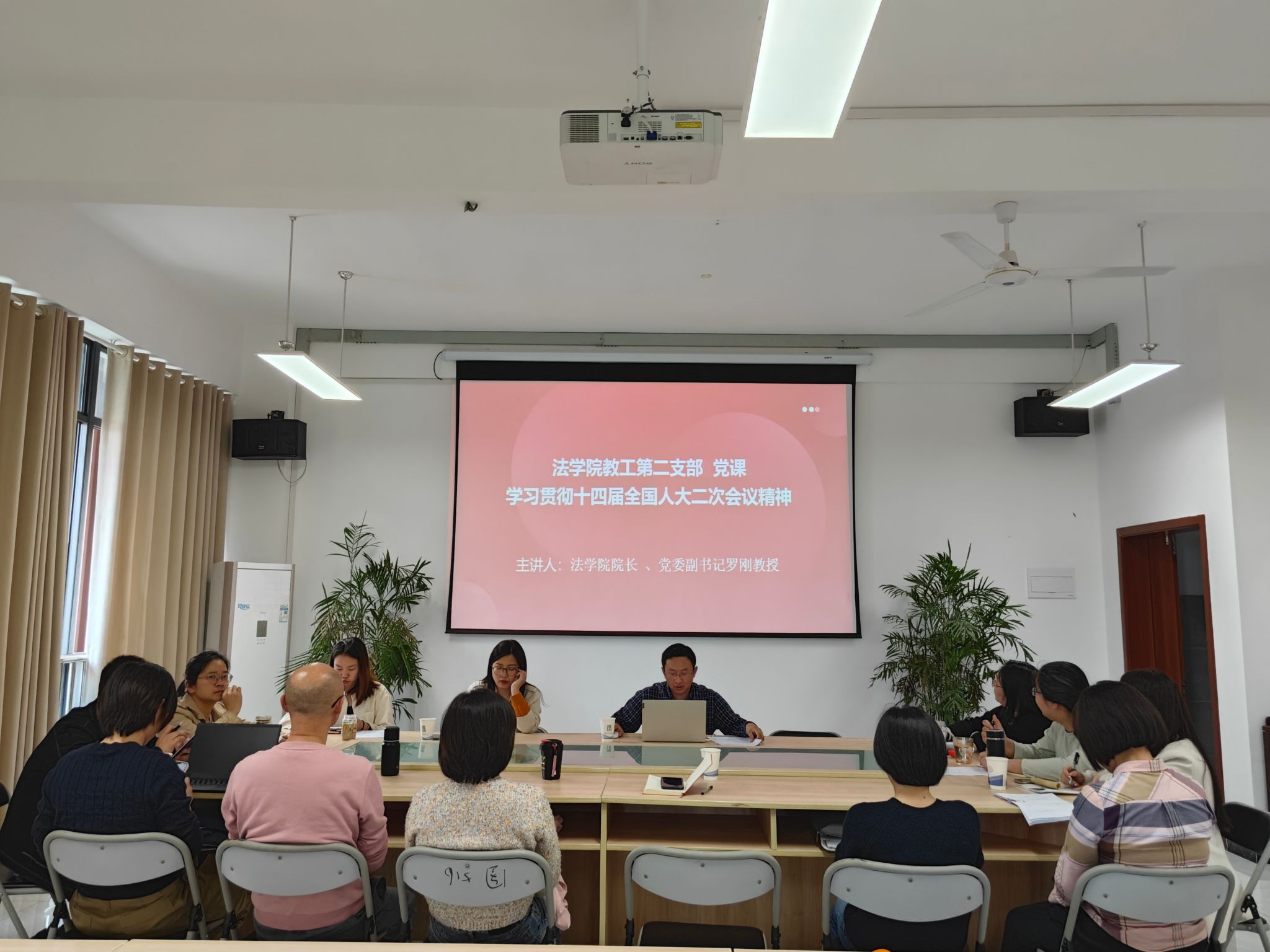会上,法学院党委副书记、院长罗刚同志做“学习贯彻十四届全国人大二次会议精神”主题的党课领学。他首先对李强总理所做的政府工作报告进行讲解,并结合《研究生教育学科专业简介及其学位基本要求(试行版)》首次将“卫生健康法学”专业作为二级学科纳入法学一级学科下这一重要变化,与在座党员同志探讨了卫生健康法学学科专业发展历史及今后的发展趋势。他强调,目前卫生健康法学涵盖了公共卫生法学、医事法学、药事法学三大专业方向,党员老师们应在科研教学方向上与时俱进,积极产出具有代表性的科研成果。