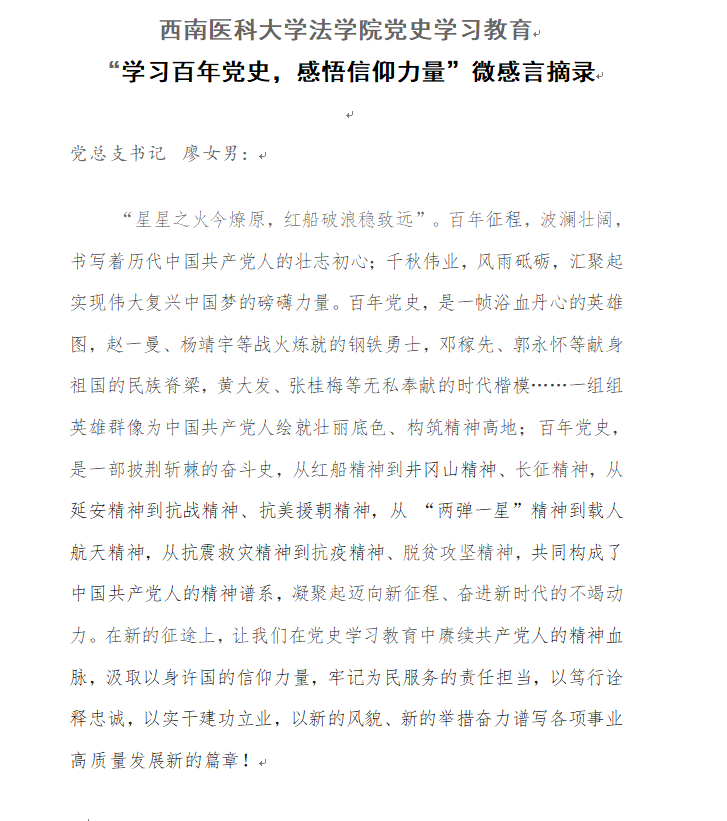 五月,是感恩的季节。在中国共产党成立百年华诞来临之际,为进一步激发全院上下学史明志的积极性和主动性,增强践行初心使命的思想自觉和行为自觉,法学院党总支于2021年5月1日--5月20日面向全院师生开展了“学习百年党史,感悟信仰力量” 微感言征集活动,全体党员、入党积极分子及师生积极响应,紧扣“回首百年路,启航新征程”主题,讴歌我党百年辉煌成就,抒发学习感悟,畅谈美好愿景。