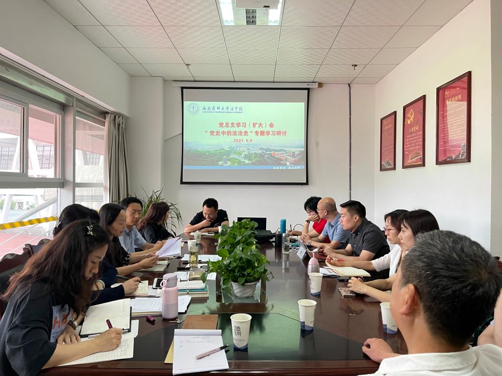 2021年6月9日,法学院党总支书记廖女男主持召开党总支学习(扩大)会暨党史学习教育专题会,组织开展对“党史中的法治史”的专题学习研讨,学院处科级干部、科室负责人、教研室和中心主任参加了本次学习研讨会。