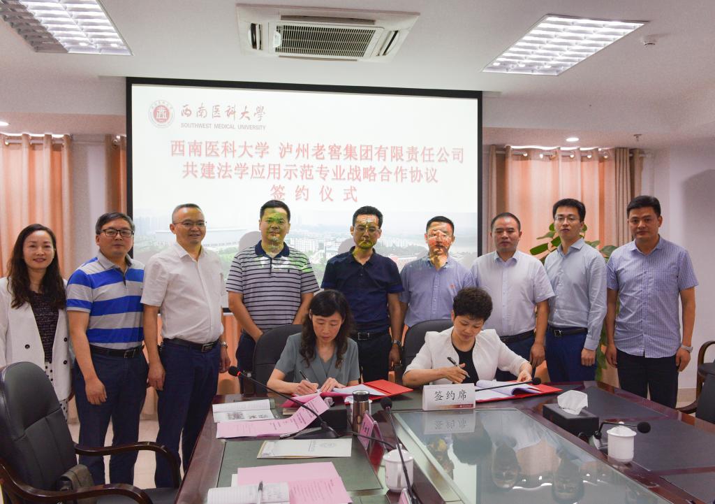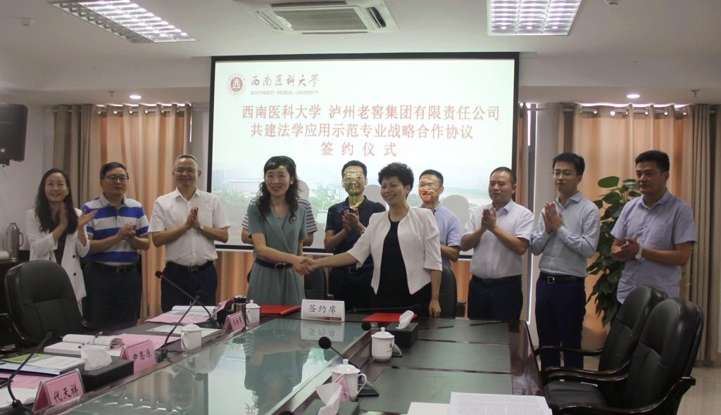 2019年6月19日上午,我校与泸州老窖集团有限责任公司共建法学应用示范专业战略合作协议签约仪式在学校德诚楼521会议室举行。泸州老窖集团有限责任公司党委委员、纪委书记、工会主席孙海燕,泸州老窖集团有限责任公司董事会秘书、总裁助理、法律事务中心总经理、泸州守正法律服务有限公司董事长程洪苹,泸州老窖集团有限责任公司人力资源中心总经理刘畅,泸州老窖集团有限责任公司法律事务中心副总经理、泸州守正法律服务有限公司总经理李春,学校党委常委、副校长何涛,校长办公室主任代天祥,人事处处长刘文胜,教务处处长尹思源,科技处处长龙汉安,法学院党政领导和师生代表参加了签约仪式。仪式由法学院党总支书记廖女男主持。