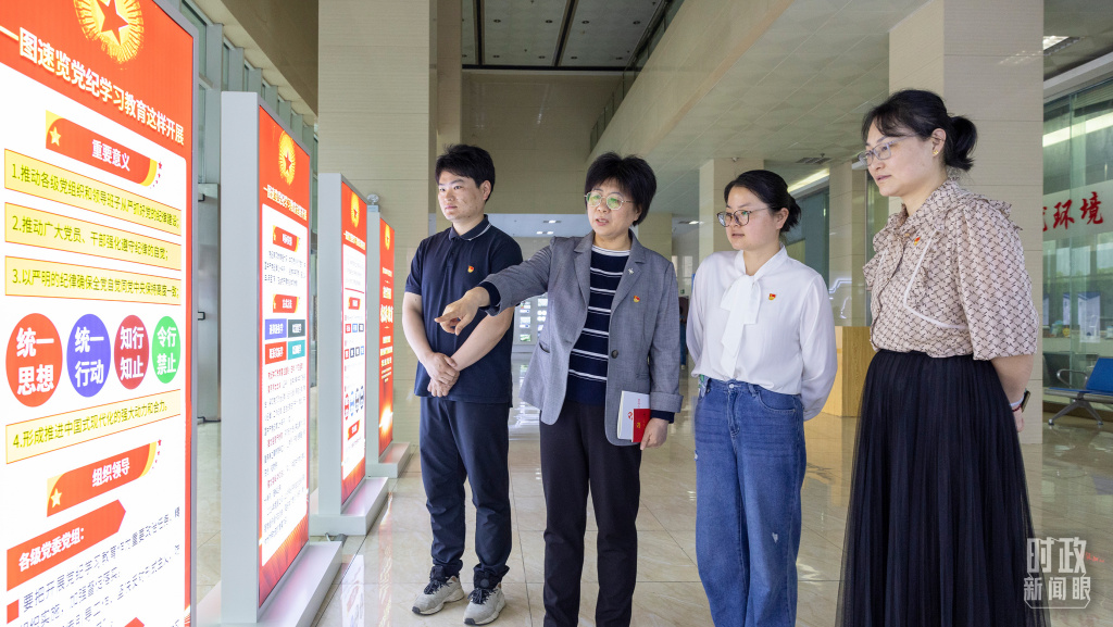 2024年5月11日,安徽合肥党员干部在党纪学习教育期间观看相关展板。(图/视觉中国)