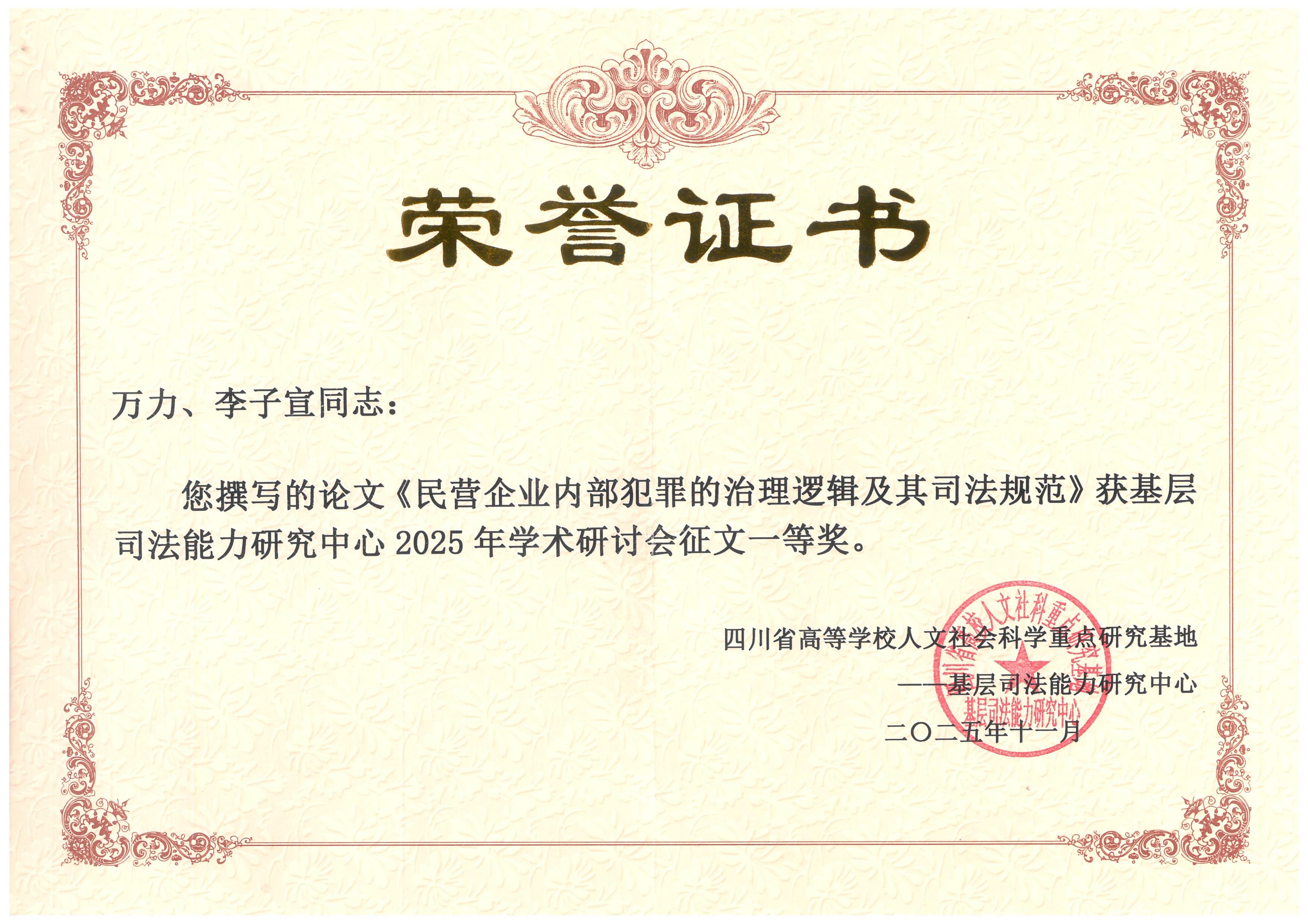 本次学术研讨会以“数字时代基层司法热点问题研究”为主题。在分议题“数字时代基层司法刑事热点问题研讨”环节,万力老师以“民营企业内部犯罪的治理逻辑及其司法规范”为题进行发言,观点获得与谈人员的高度评价。该文获得四川省基层司法能力研究中心“数字时代基层司法热点问题研究”学术研讨会暨2025年年会征文一等奖。