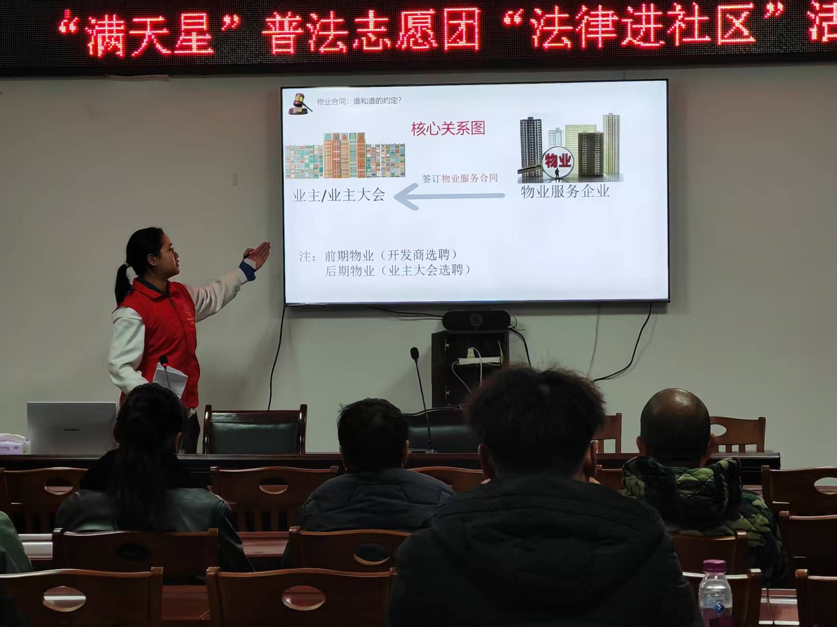作为校地联合普法工程的重要实践载体,本次活动严格遵循“需求导向、精准普法”的工程实施原则。活动前期,志愿服务团在指导教师统筹下,与打古镇、社区两级干部深度对接,通过座谈交流、需求调研等方式,系统梳理出社区居民在房产物业、婚姻家庭、文明养犬等领域的高频法律关切点,精准锚定基层普法的痛点与难点。在此基础上,团队结合法学专业知识体系,精心构建宣讲框架、打磨宣讲内容,确保宣讲既有法律条文的专业支撑,又贴合居民生活实际,切实彰显“满天星”工程“专业赋能、服务民生”的核心内涵,助力实现“全民知法、自觉学法、严格守法、善于用法”的普法目标。