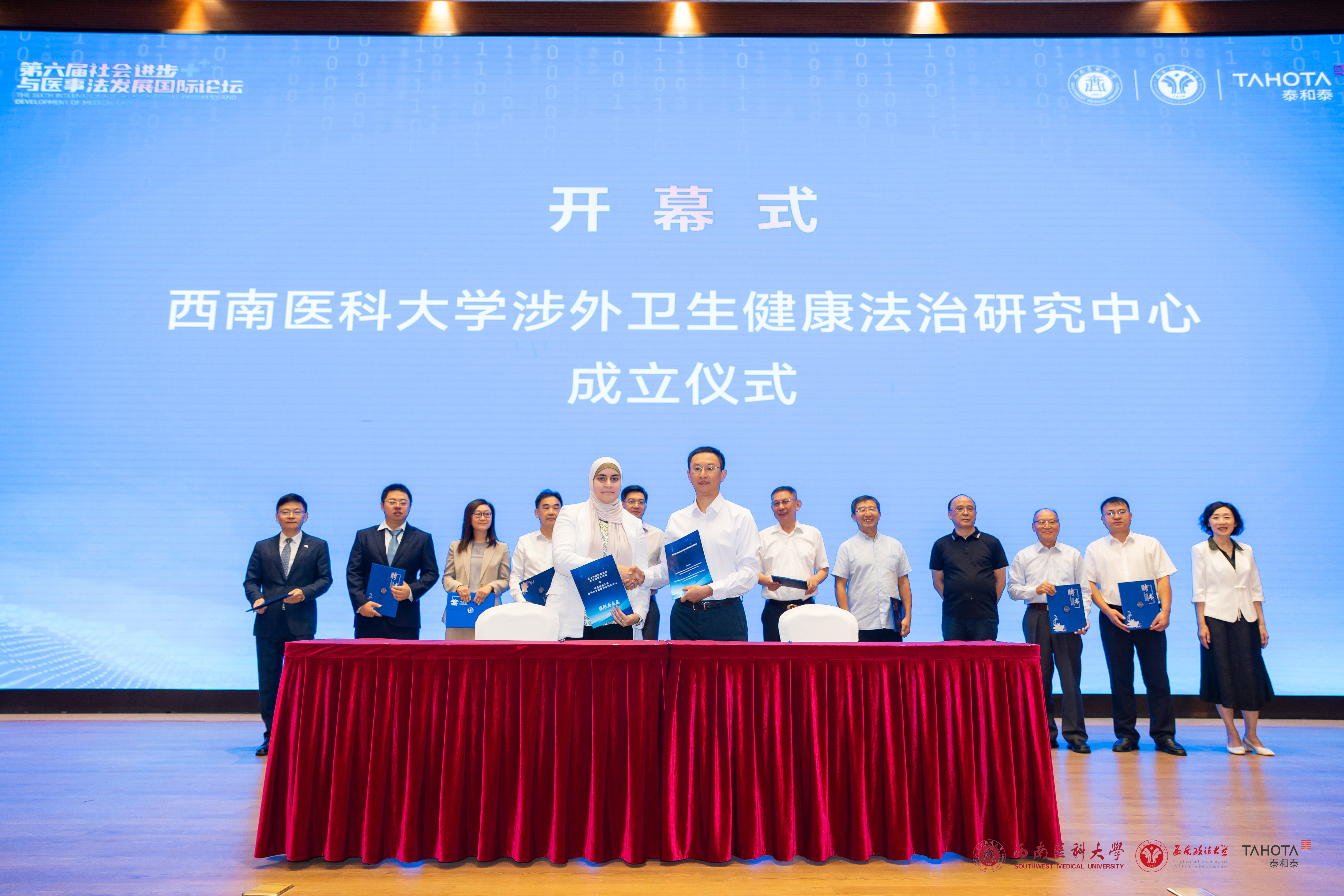 开幕式上,举行了西南医科大学涉外卫生健康法治研究中心成立仪式。学校党委副书记、校长何涛为中心授牌,并向首批受聘的13位专家颁发聘书。中心主任罗刚与红十字国际委员会东亚代表处法律部负责人MARWA女士签署合作备忘录。