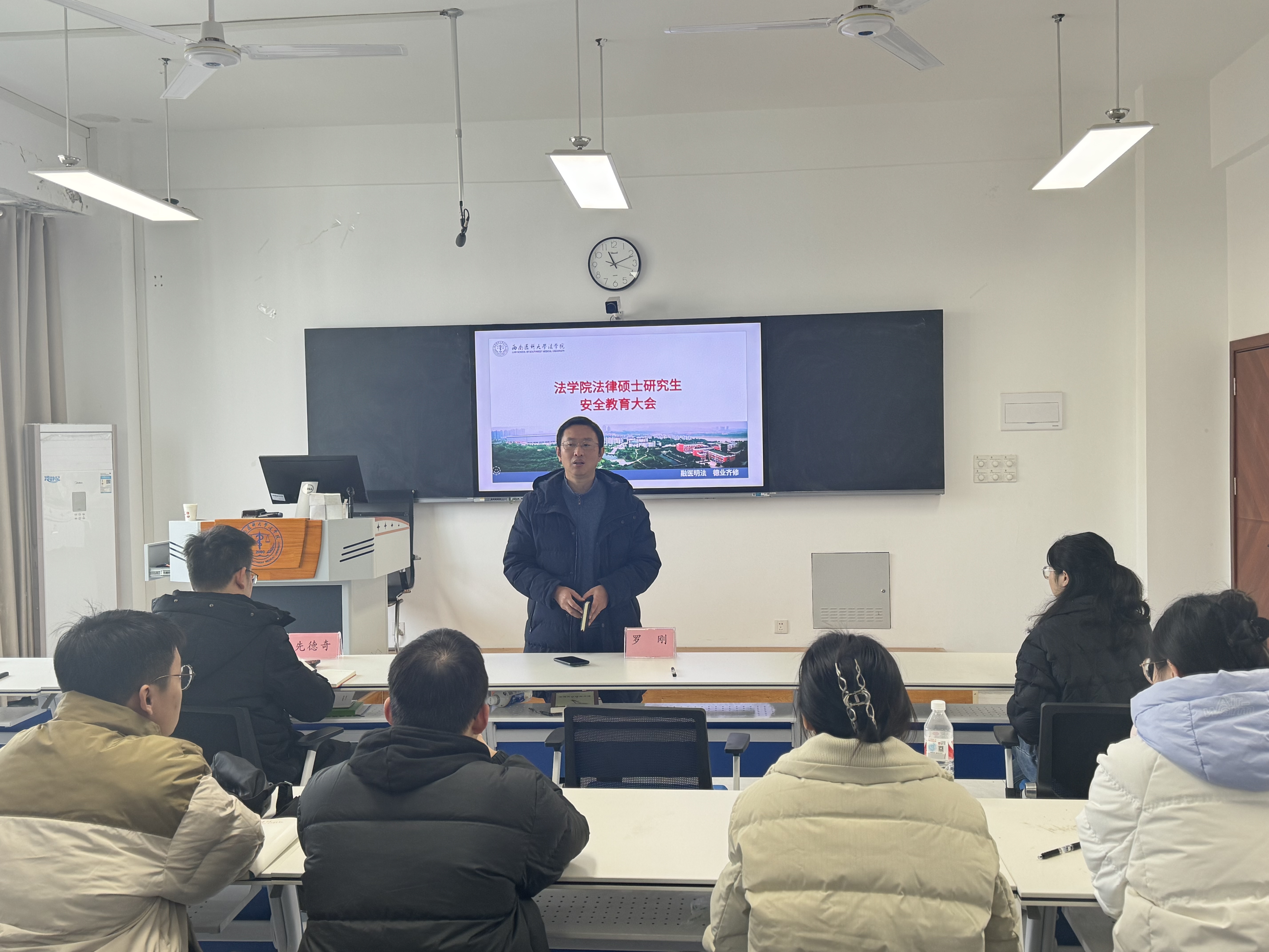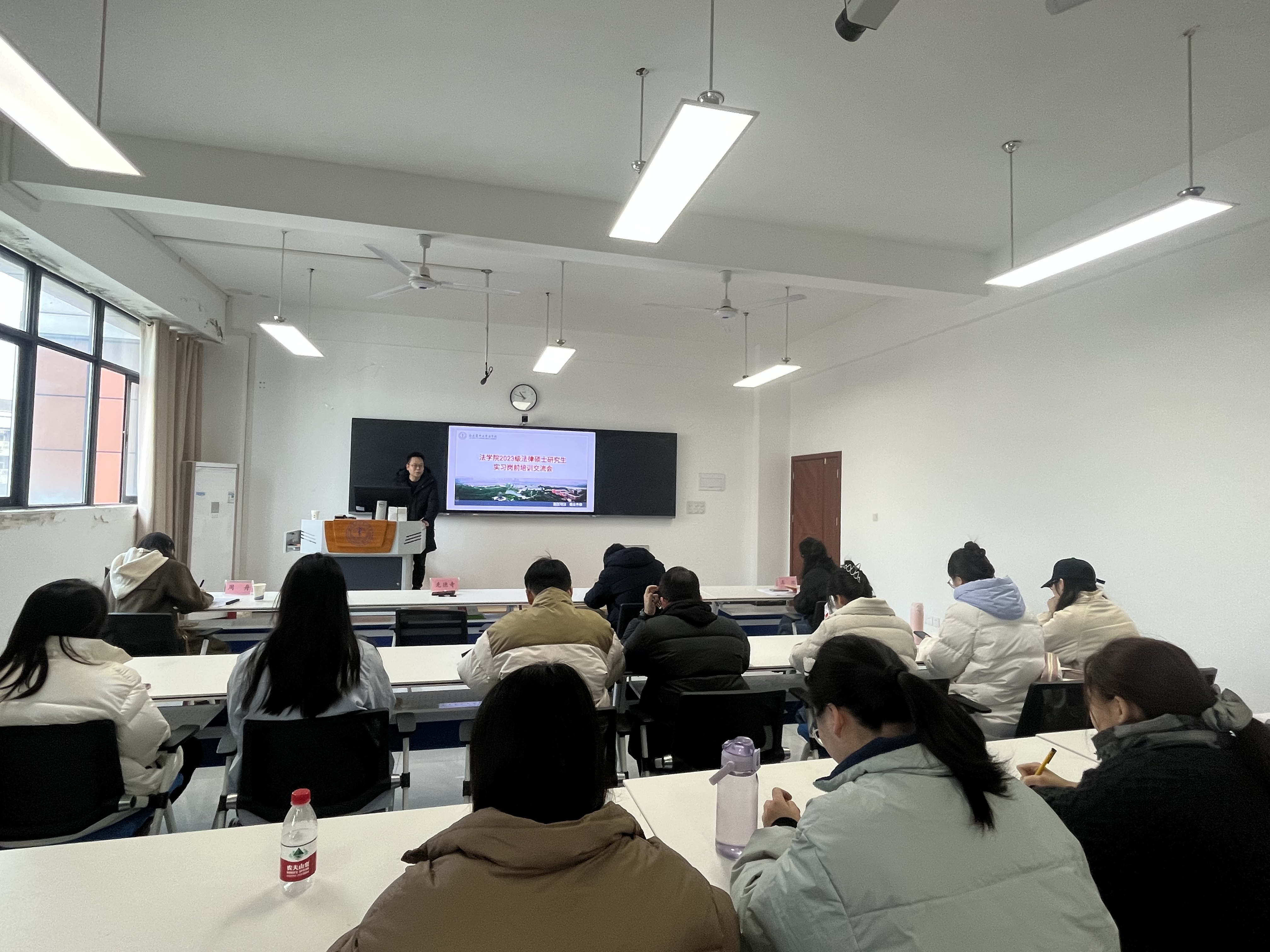 12月26日上午,法学院2023级法律硕士研究生实习岗前培训交流会在文渊楼501教室举行,法学院院长罗刚、副院长先德奇、法律硕士教育中心副主任王瑞、辅导员周舟、2022级研究生代表及全体2023级研究生参加了交流会。会议由王瑞主持。