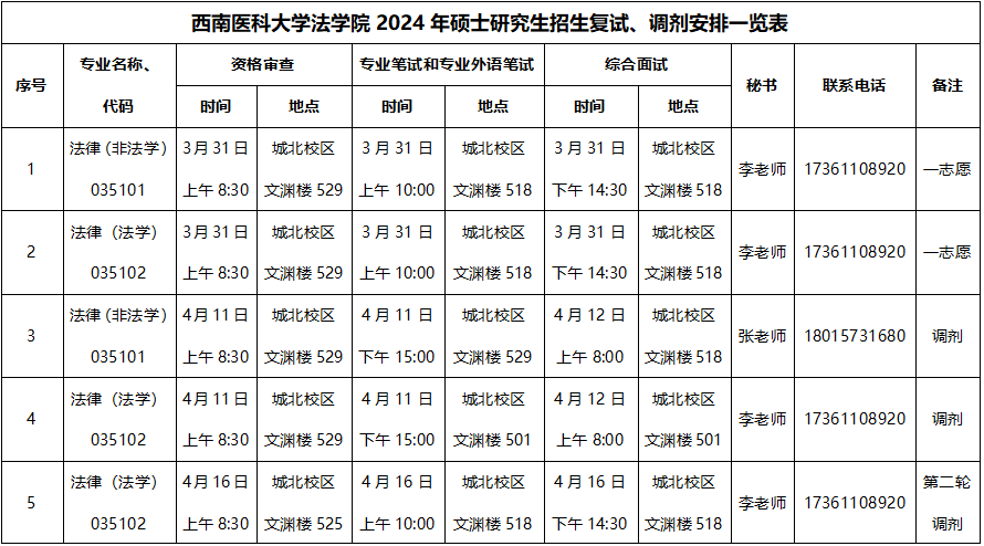 注:所有考生资格审查时所需提供材料请见《西南医科大学2024年硕士研究生招生考试复试考生须知》及《西南医科大学法学院2024年硕士研究生招生复试、调剂工作细则》,请各位考生保持手机畅通。